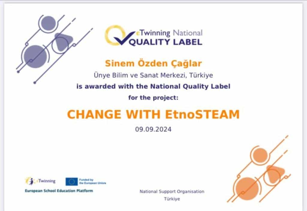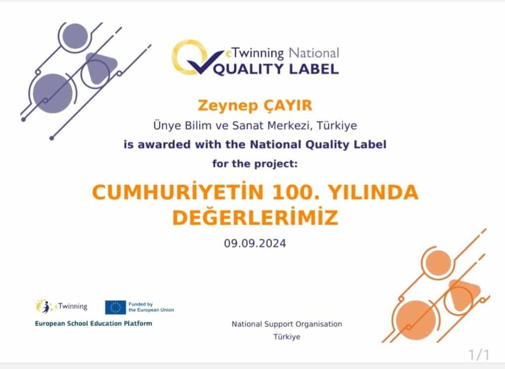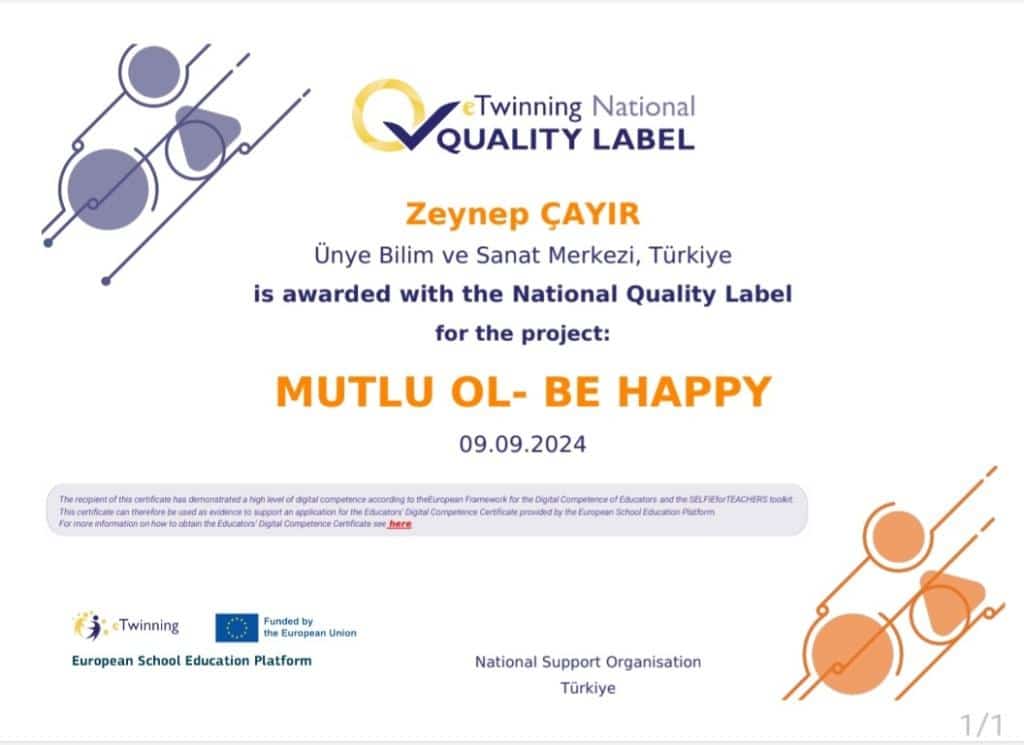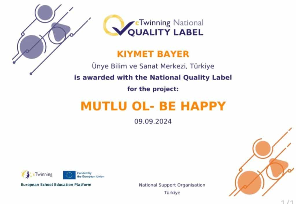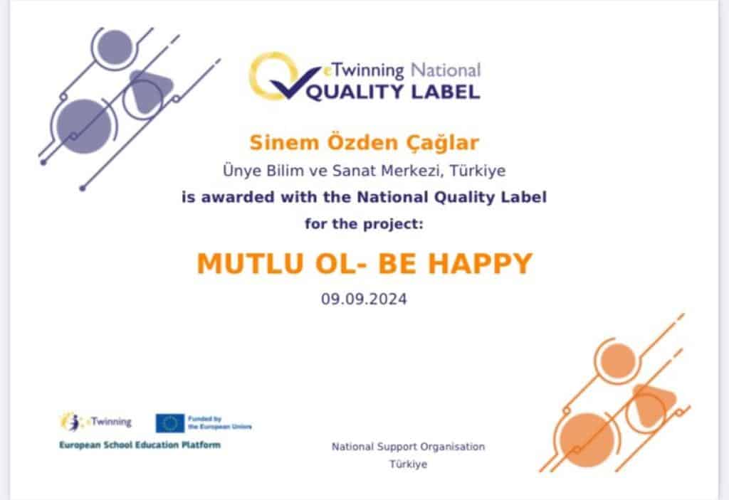 2023/2024 Eğitim Öğretim yılında kurumumuzda yürütülen eTwinning Projeleri, Eğitim Teknolojileri Genel Müdürlüğü Ulusal Destek Servisi tarafından Kalite Etiketi ile ödüllendirilmiştir. Mutlu Ol-Be Happy projemiz Dijital Yeterlilik Sertifikası da almıştır. Öğretmenlerimizi ve öğrencilerimizi tebrik eder başarılı çalışmalarının devamını dileriz.