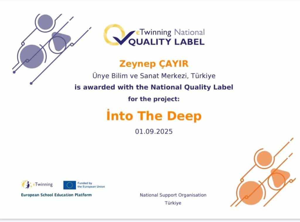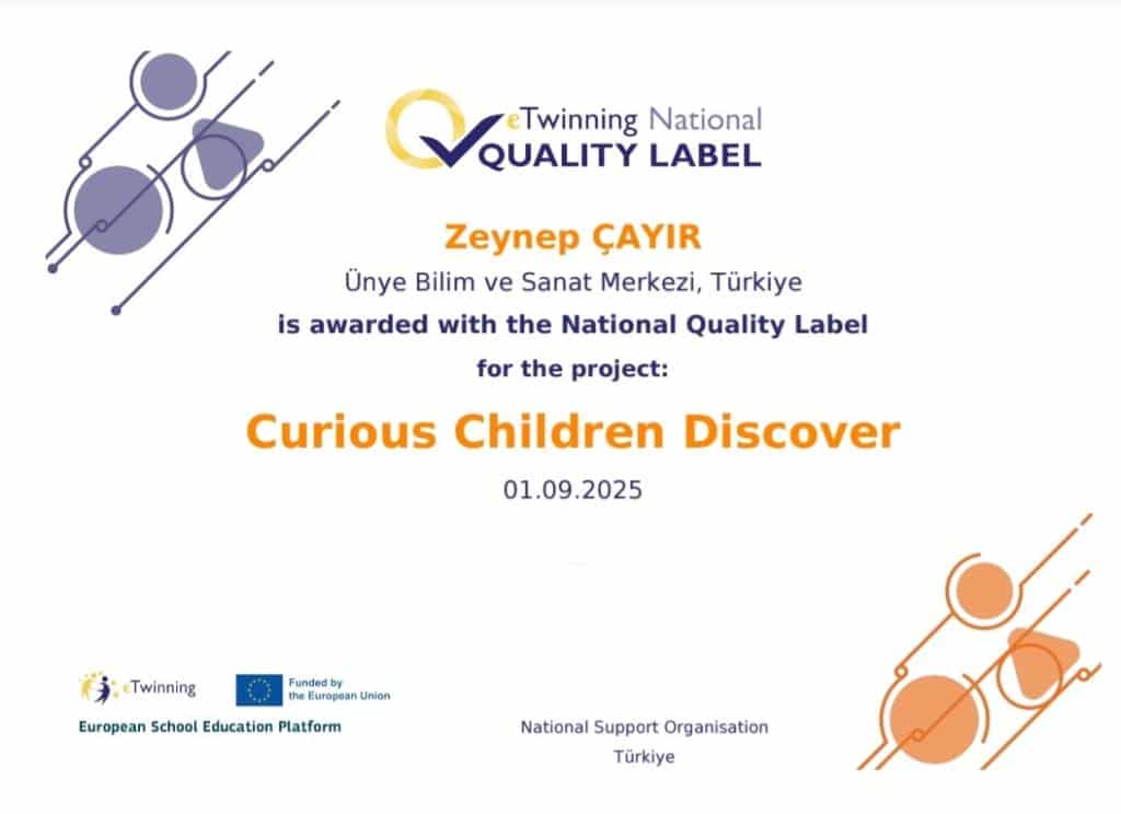 Kurumumuzda 2024/2025 Eğitim Öğretim yılında yürütülen eTwinning projeleri Ulusal Kalite Etiketi almaya hak kazanmıştır. Projelerde çalışan öğretmen ve öğrencilerimizi tebrik ederiz.